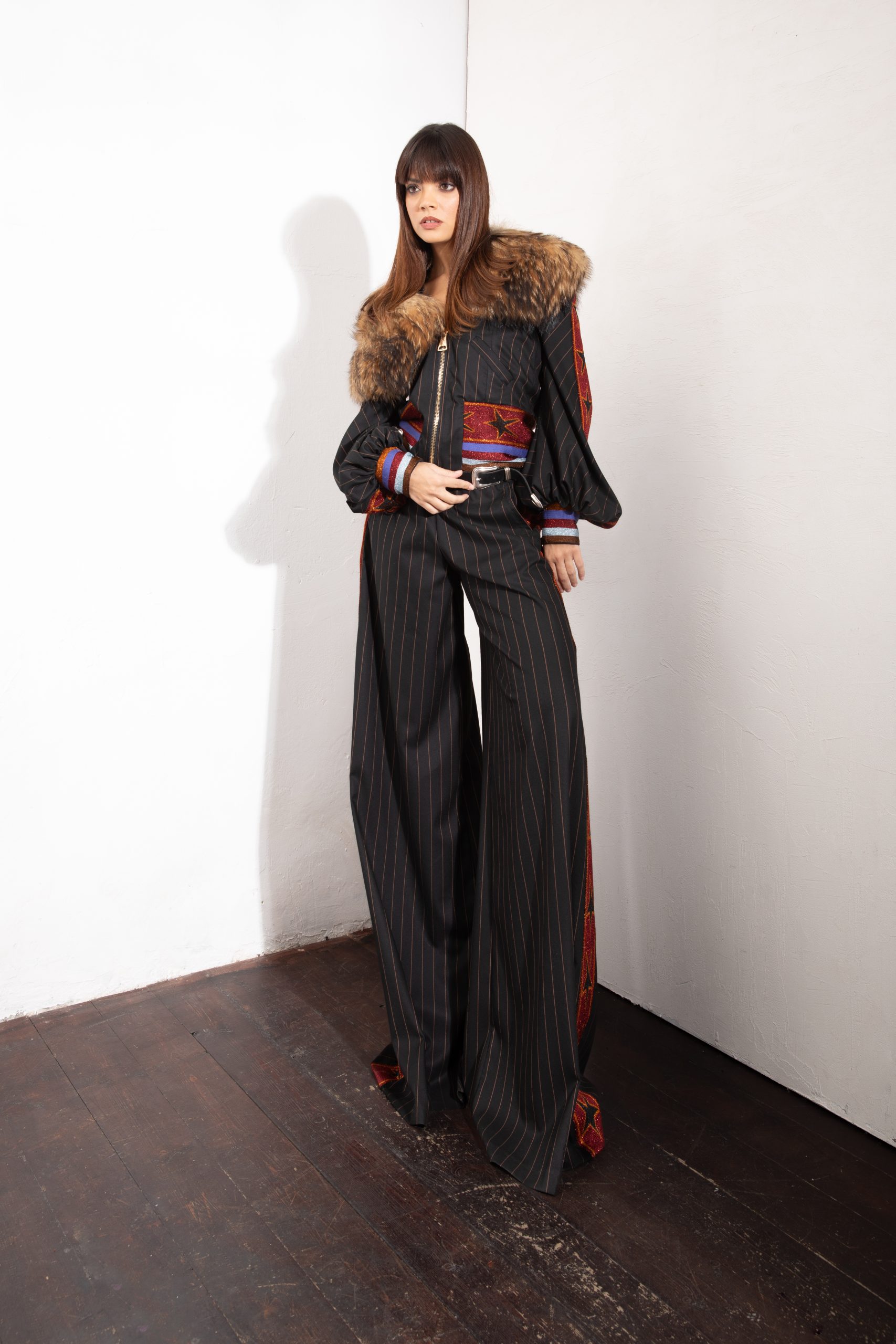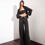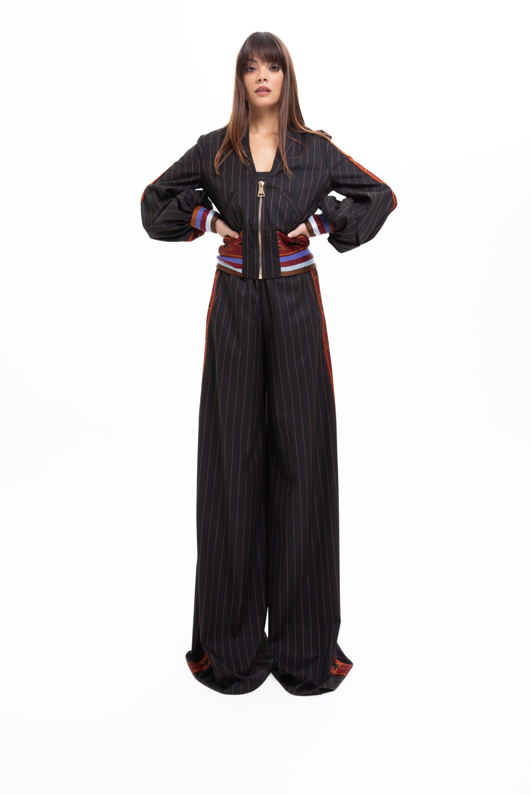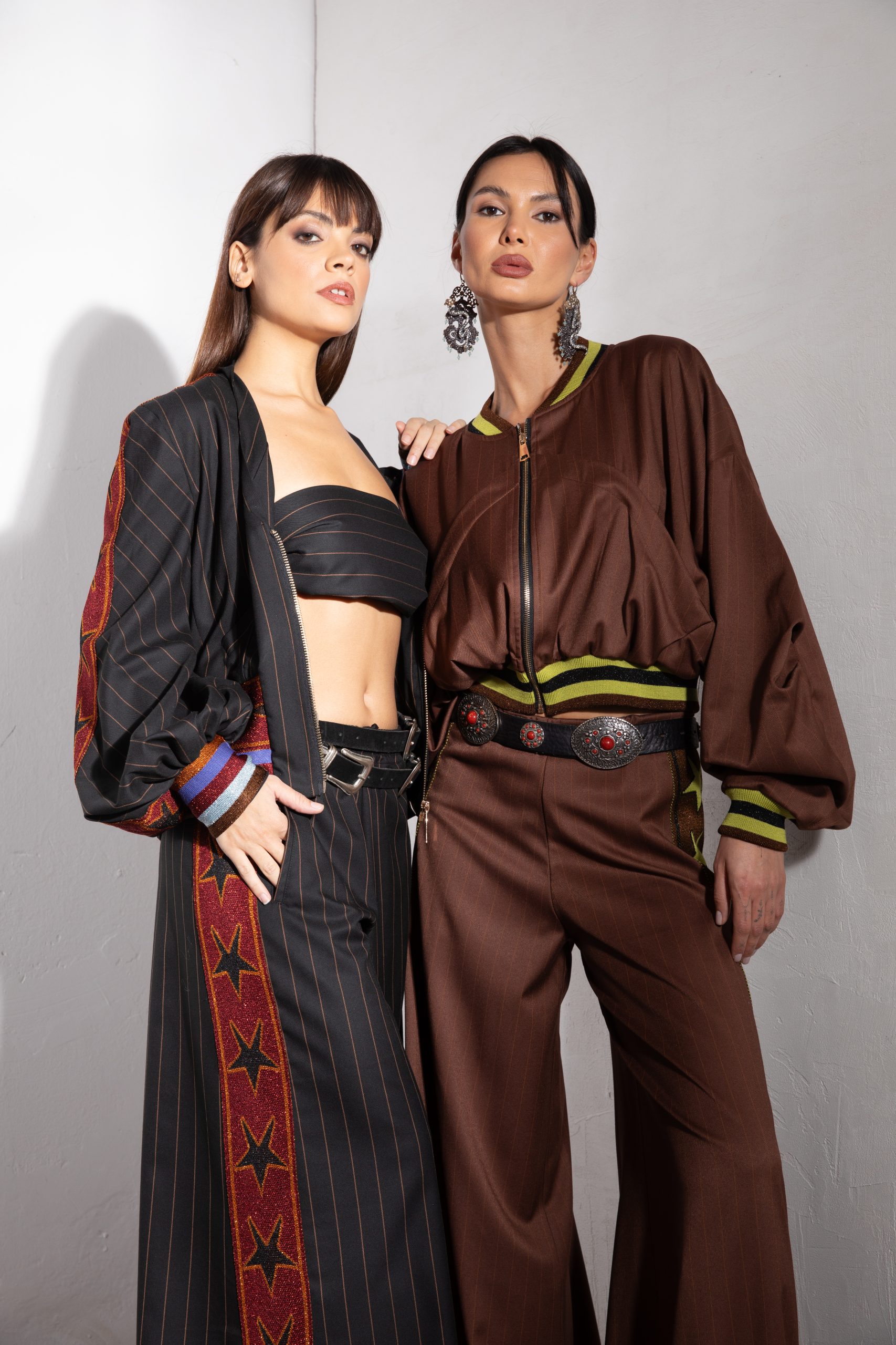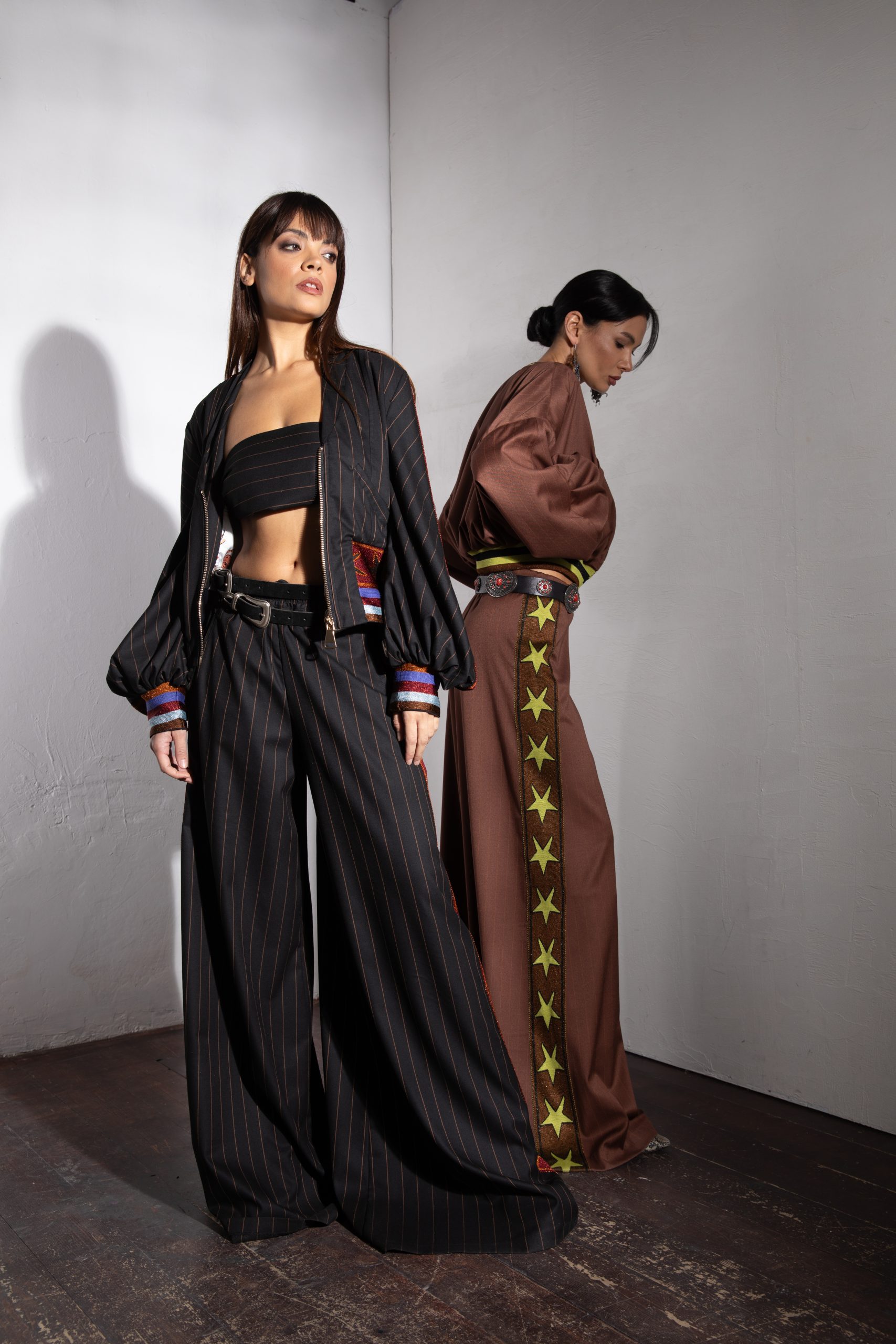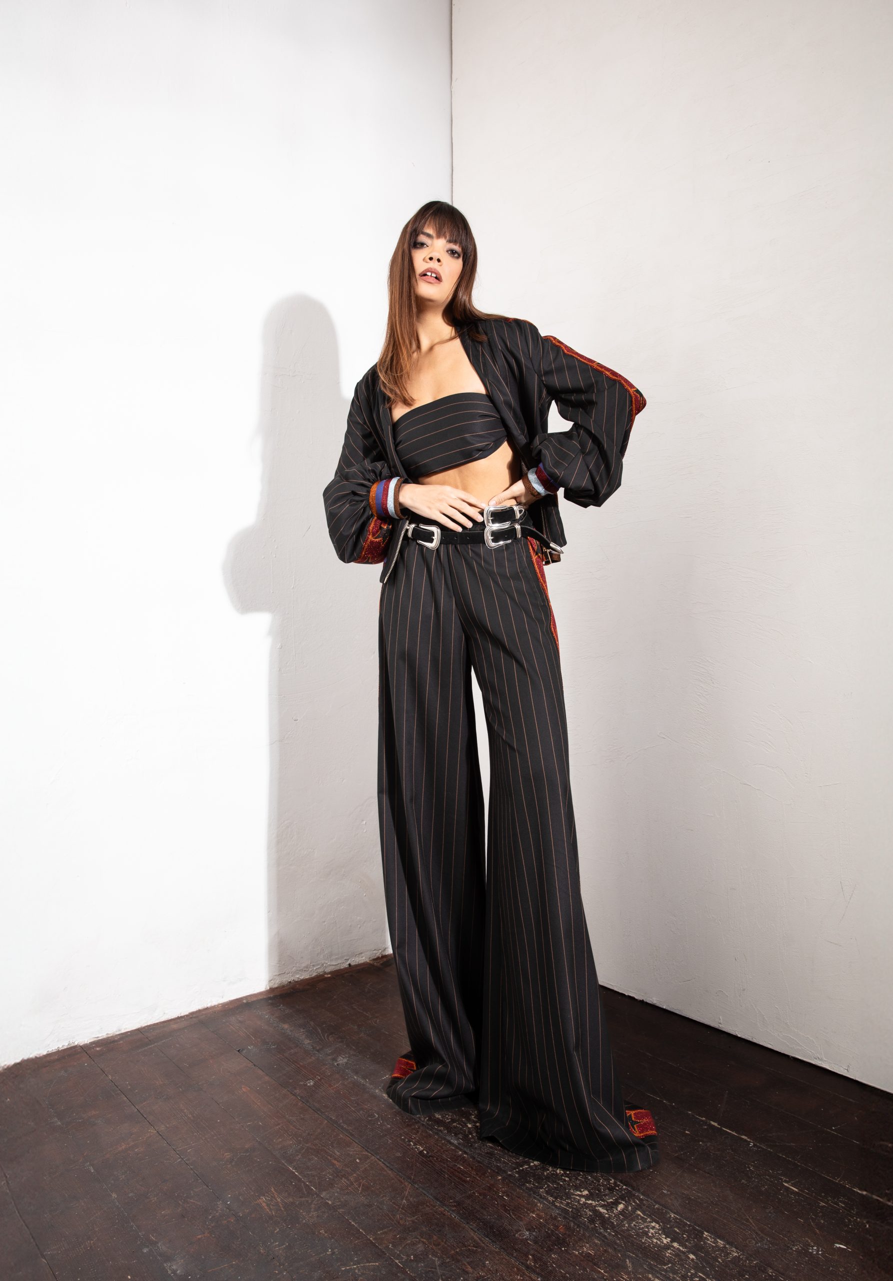 A pant that combines the rigor of pinstripes with the freedom of a wide, flowing line. The side bands traversed by lurex stars tell of movement and energy, transforming an everyday garment into a detail of personality. Comfortable yet sophisticated, it becomes the ideal companion for those who want to move in style without sacrificing comfort.